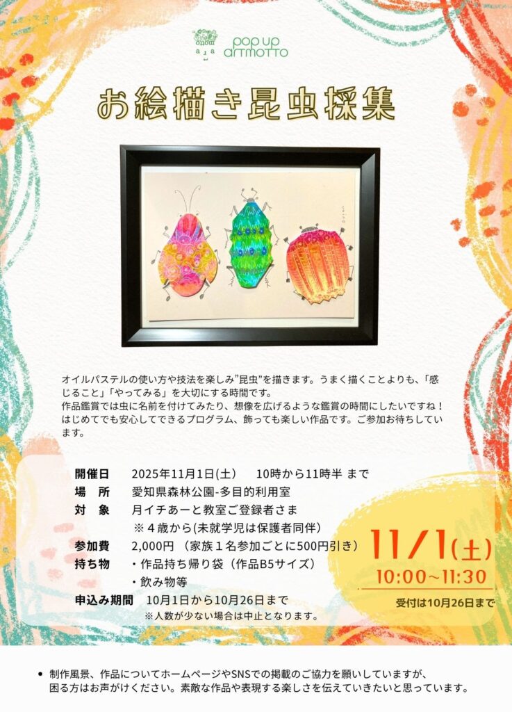 オイルパステルの使い方や技法を楽しみ”昆虫”を描きます。うまく描くことよりも、「感じること」「やってみる」を大切にするあーと体験!作品鑑賞は、想像を広げるような鑑賞の時間にしたいですね!はじめてでも安心してできるプログラム、飾っても楽しい作品です。ご参加お待ちしています。
