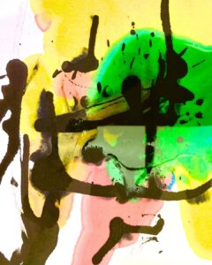 黄色と青と緑が混ざりあいながら、なにかきらきらする作品だな~、私が今朝見た大きな木の葉の隙間から見える光のような。なんて感じていたら、そんな気持ちとは、裏腹に