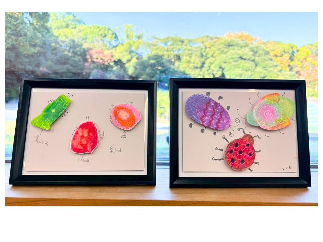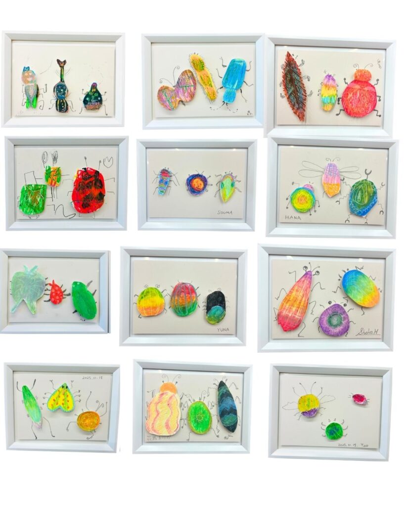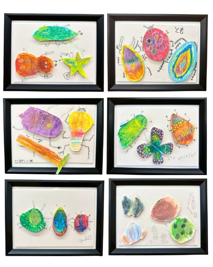 ワクワクした気持ちを胸に取り組む子、大好きな昆虫のリアルさを組み合わせて表現する子、画材から生まれる色やスクラッチ技法の楽しさから新しい昆虫を生み出す子――それぞれの世界が広がり、多彩な魅力でいっぱいになりました。